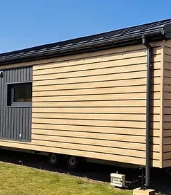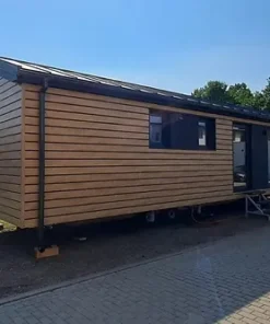 Modelo A – casa móvil sobre ruedas. Es el tipo de casa más elegido por los clientes. El modelo A tiene una forma rectangular tradicional cubierta por un techo blando. Está disponible en varias distribuciones interiores funcionales. El aspecto exterior, como la combinación de colores, la selección de materiales y la ubicación de las ventanas, puede personalizarse para satisfacer las necesidades del cliente.