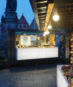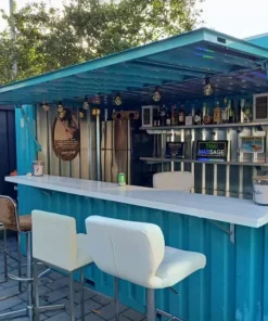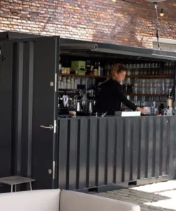 El contenedor de bar está equipado con un toldo plegable y puertas dobles, disponibles en el lado largo y en el lado corto. Las dimensiones son similares a las de un contenedor desmontable de 16 pies, pero el ancho y el largo son medio metro más largos.
