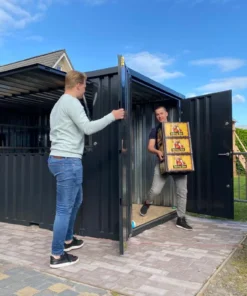 La cubierta de este contenedor es súper resistente y contiene un sistema hidráulico. Este sistema permite subir y cerrar la lona con total seguridad. Además, la doble puerta del contenedor permite colocar objetos de gran tamaño como barriles de cerveza, congeladores, mesas, etc. Es por tanto la forma ideal de ofrecer una bebida o un snack a clientes o amigos.